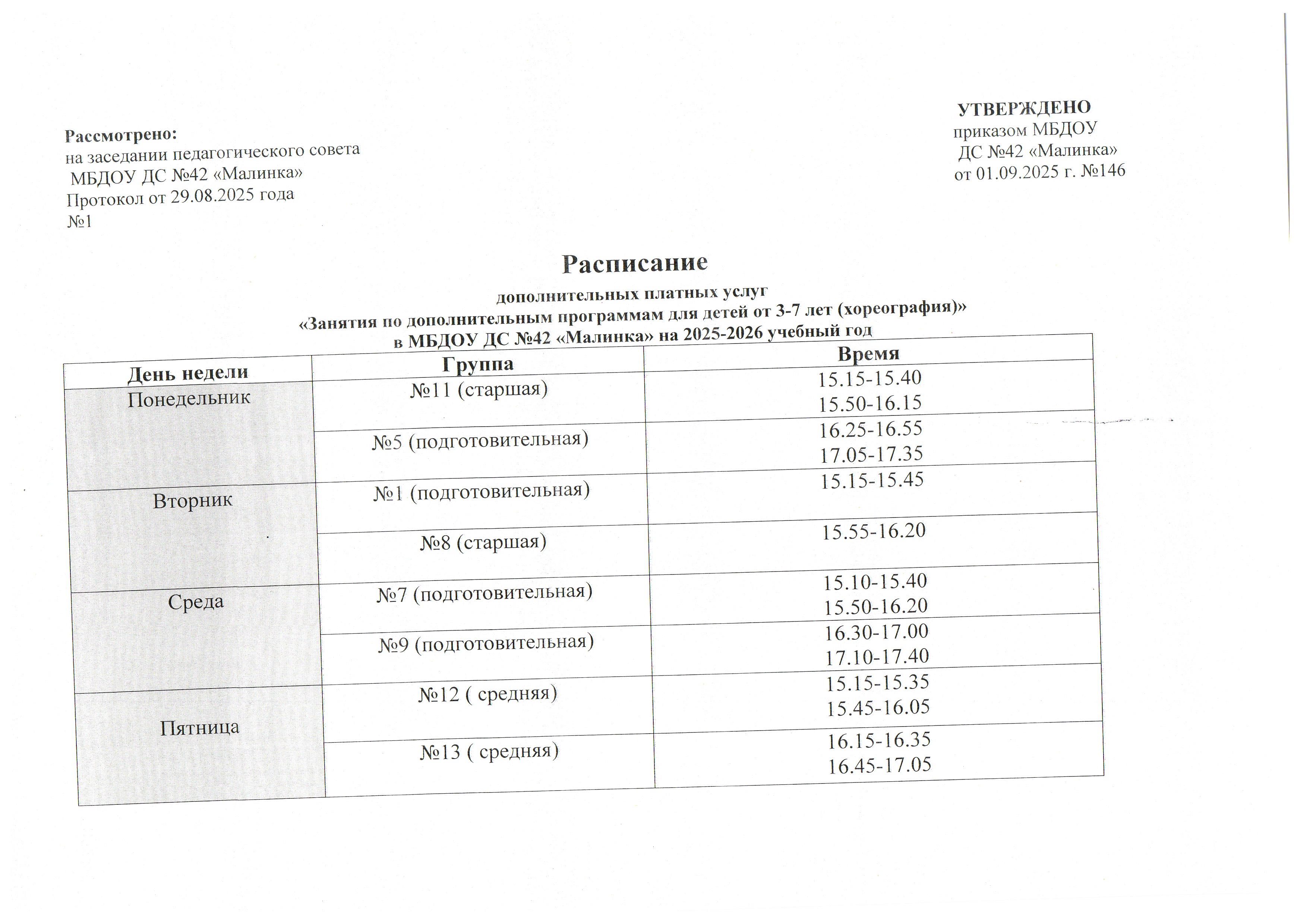 Расписание ООД платных дополнительных образовательных услуг в МБДОУ ДС № 42 "Малинка" на 2025-2026гг.(хореография) Скачать