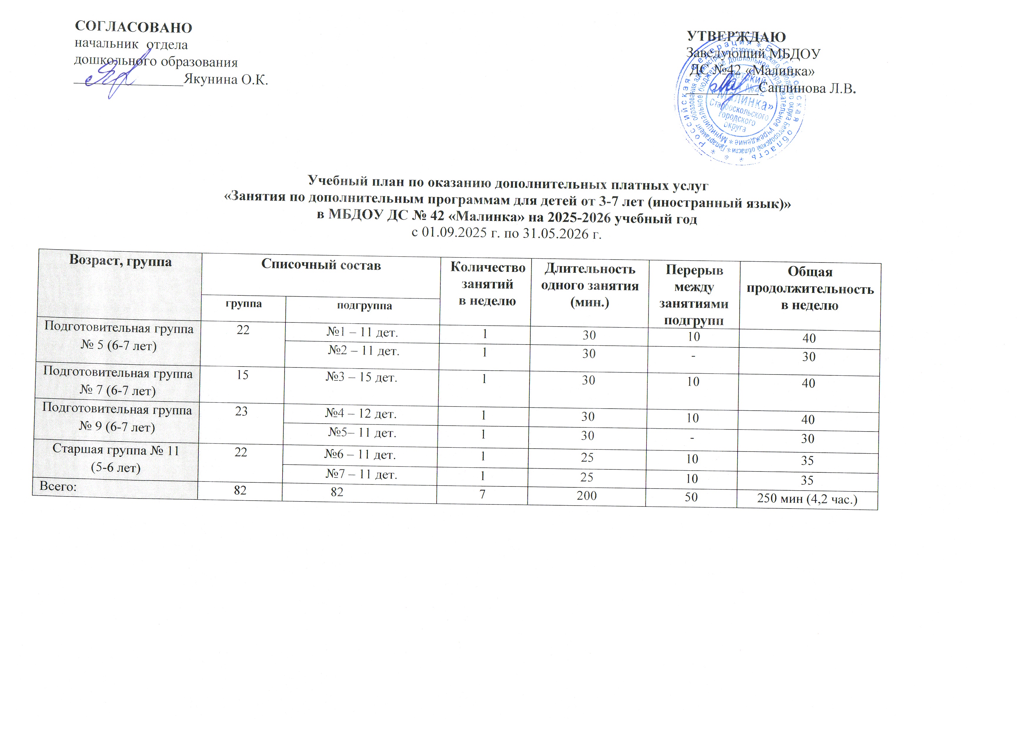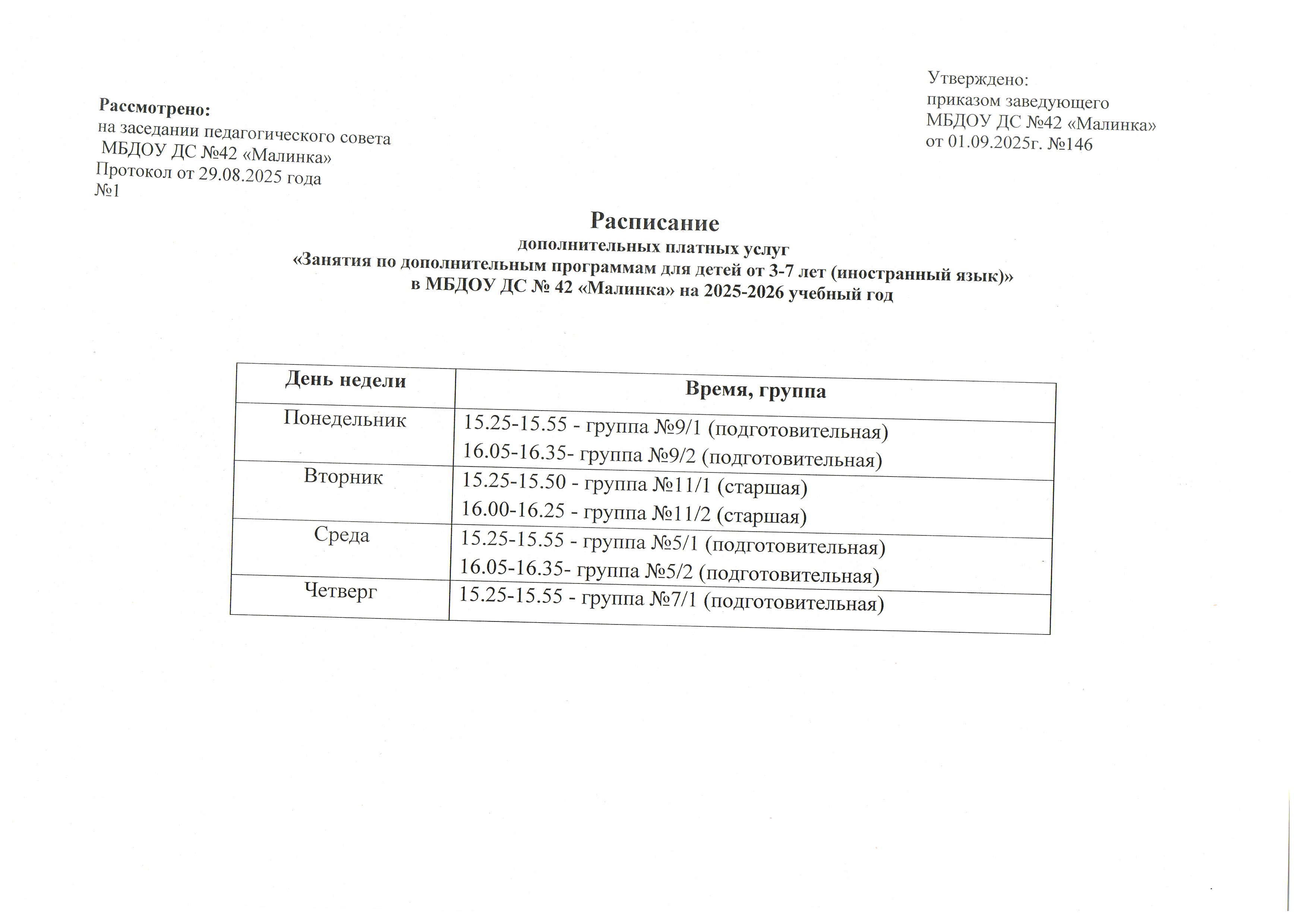 Расписание ООД платных дополнительных образовательных услуг в МБДОУ ДС № 42 "Малинка" на 2025-2026 гг.(английский язык) Скачать
