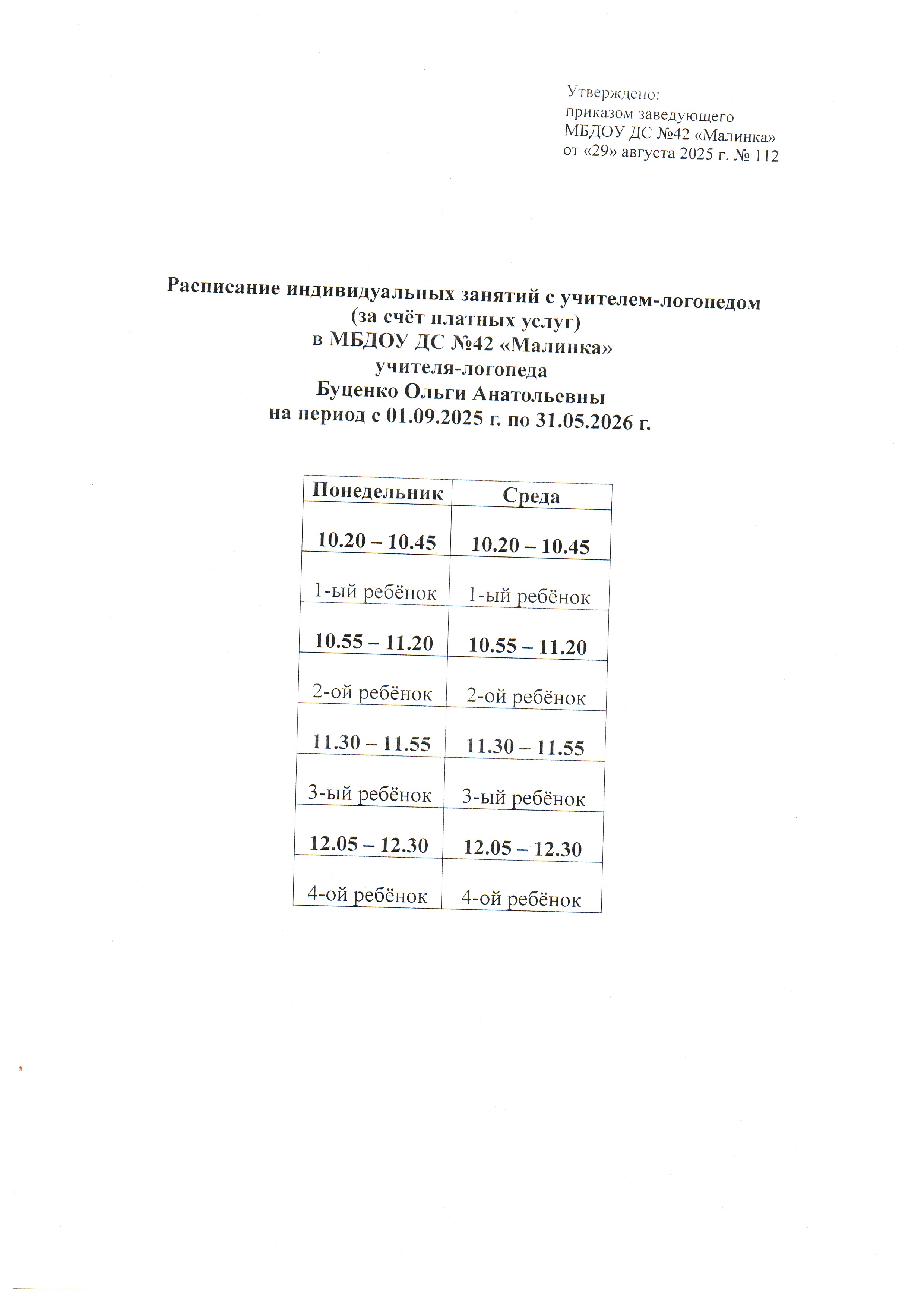 Расписание ООД платных дополнительных образовательных услуг в МБДОУ ДС № 42 "Малинка" на 2025-2026 гг. (индивидуальные занятия с учителем-логопедом) Скачать