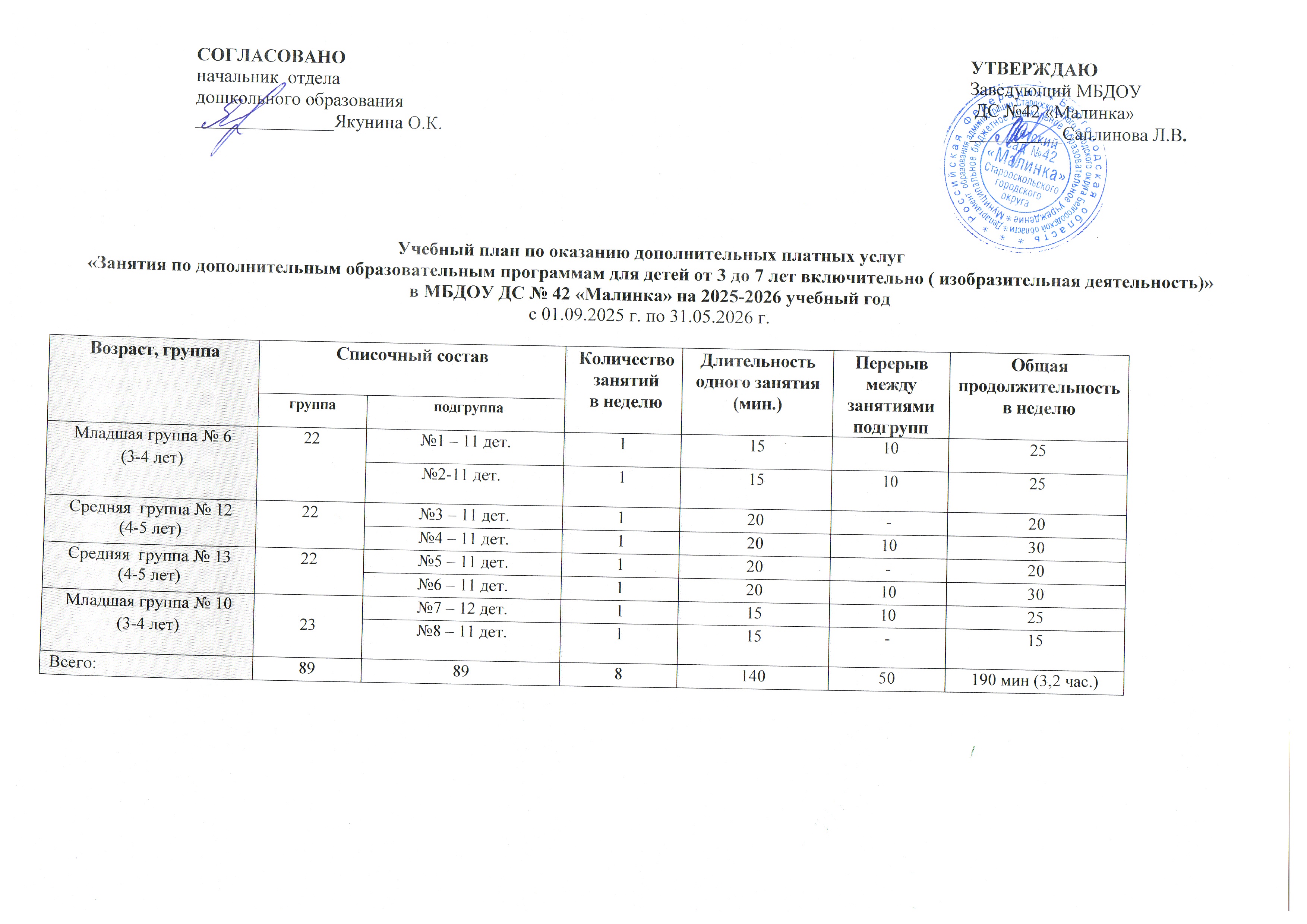 Учебный план ООД платных дополнительных образовательных услуг в МБДОУ ДС № 42 "Малинка" на 2025-2026 гг. (ИЗО) Скачать