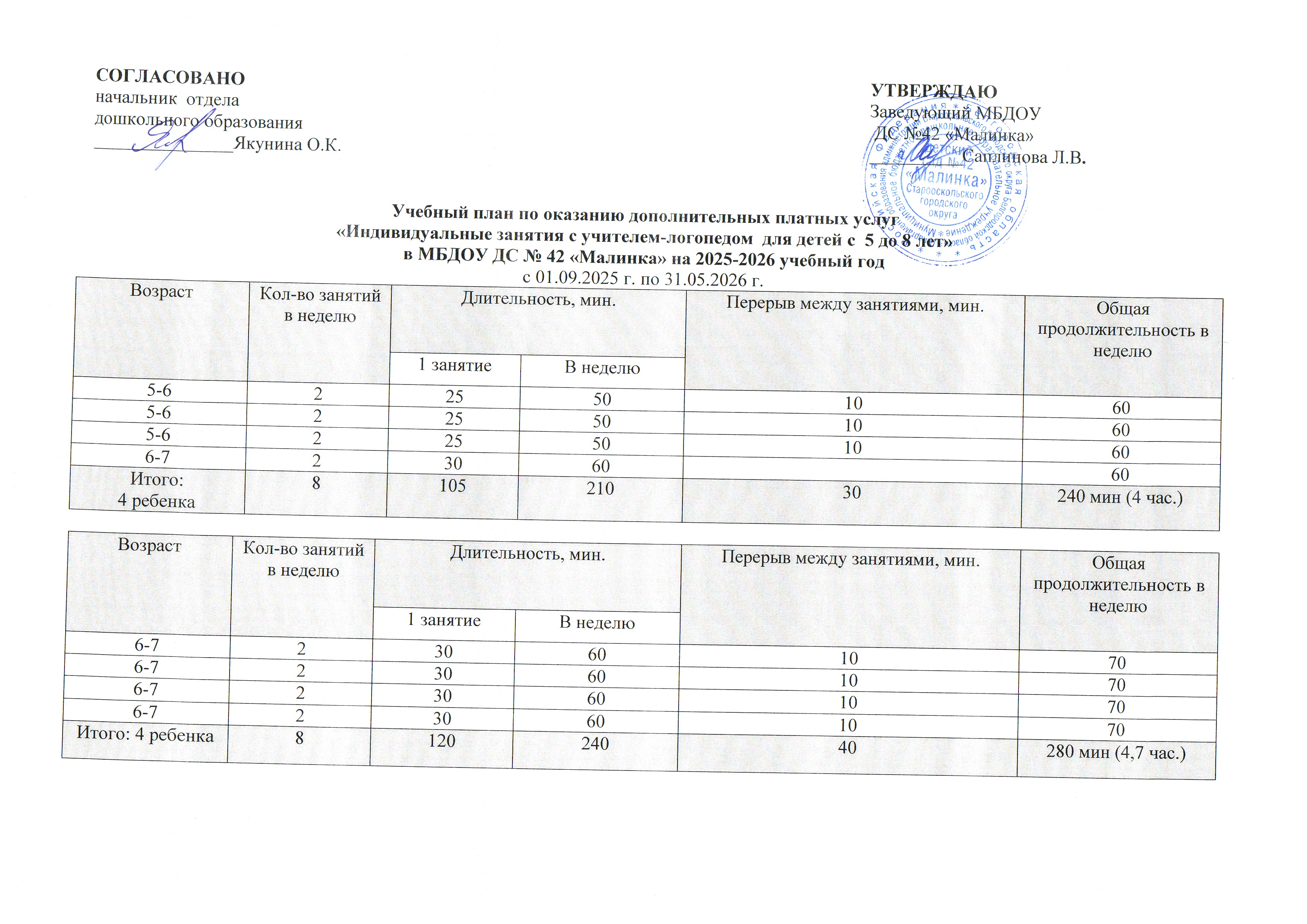 Учебный план ООД платных дополнительных образовательных услуг в МБДОУ ДС № 42 "Малинка" на 2025-2026 гг. (индивидуальные занятия с учителем-логопедом) Скачать